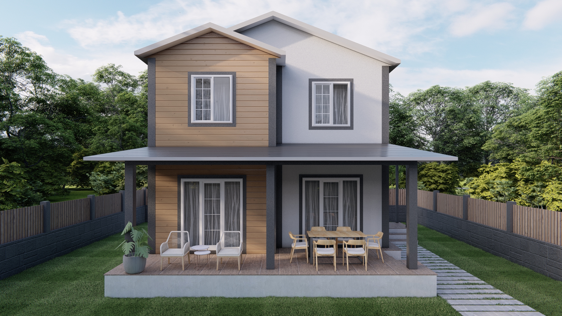 - Geniş Veranda: Koyu renkli sütunlarla desteklenen ve oturma alanı bulunan veranda.