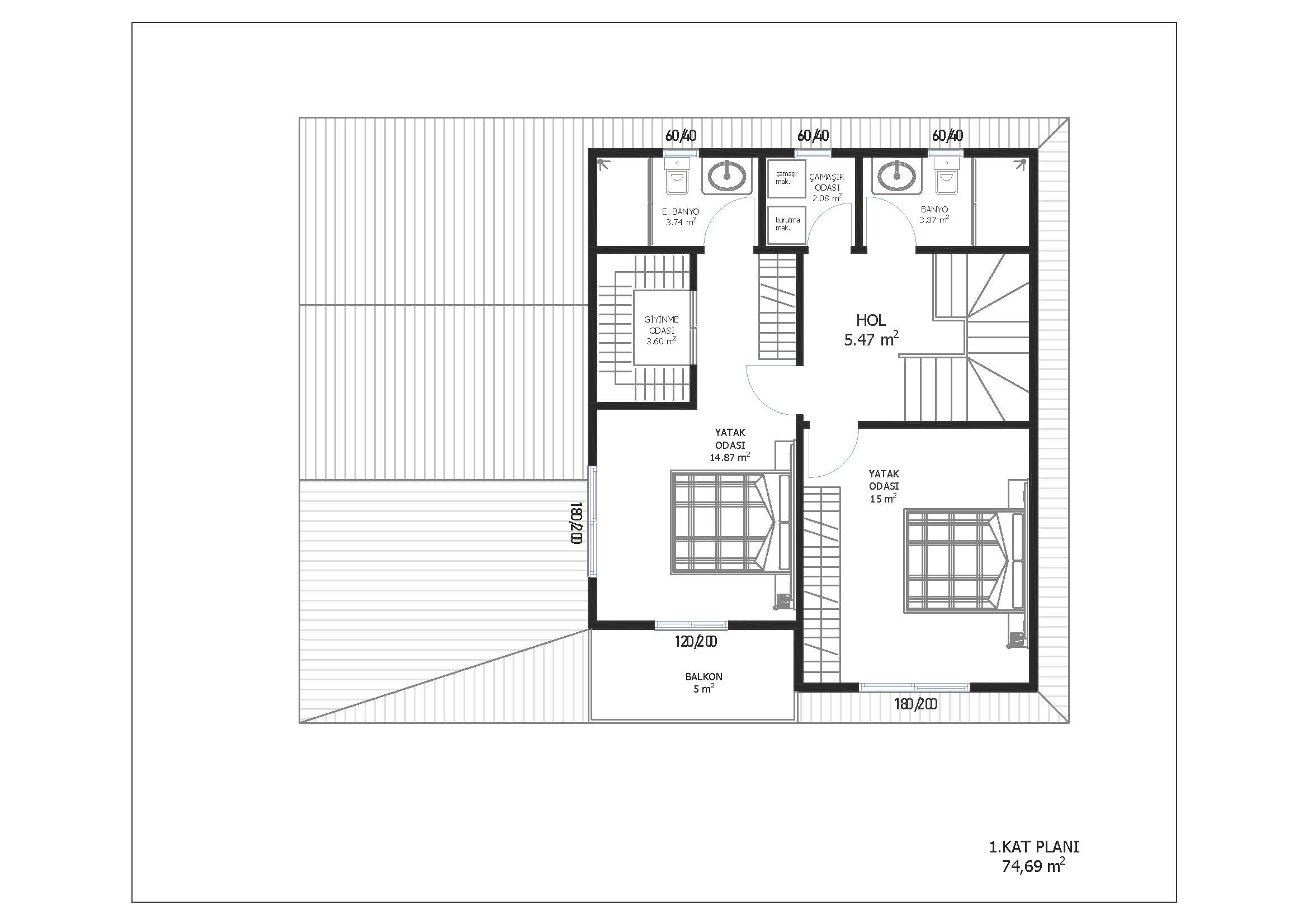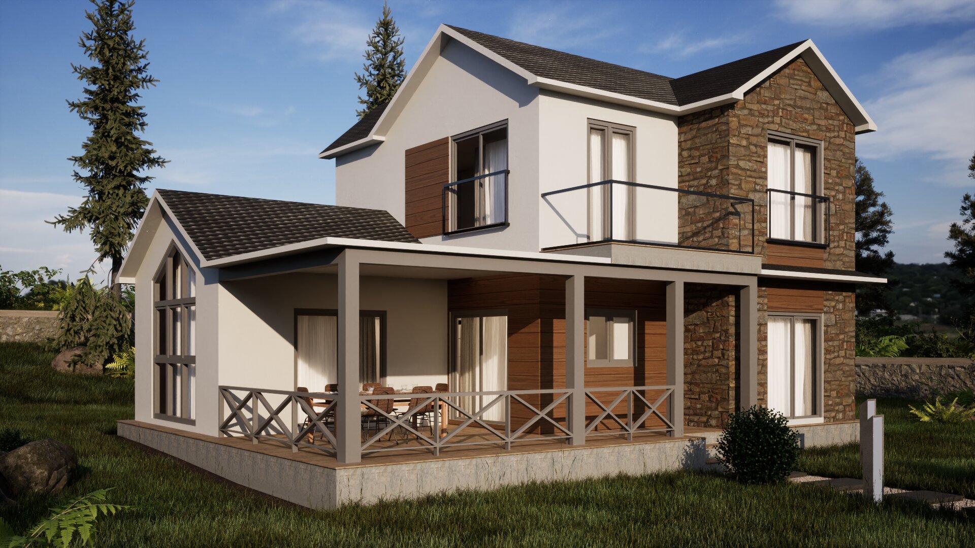 - Rustik Dokunuş: Sağ cephede taş kaplama ve kontrast yaratan detaylar.