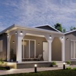 Çağdaş bir tasarım anlayışı ile inşa edilmiş. Gri tonların hakim olduğu dış cephe, beyaz sütunlar ve çerçeve detaylarıyla zarif bir kontrast oluşturuyor. Verandanın etrafını çevreleyen minimalist aydınlatma armatürleri, evin geceleri de hoş ve davetkar bir görünüm kazanmasını sağlıyor. Bu aydınlatmalar, hem güvenlik hem de estetik açıdan evin dış mekan tasarımına değer katıyor.