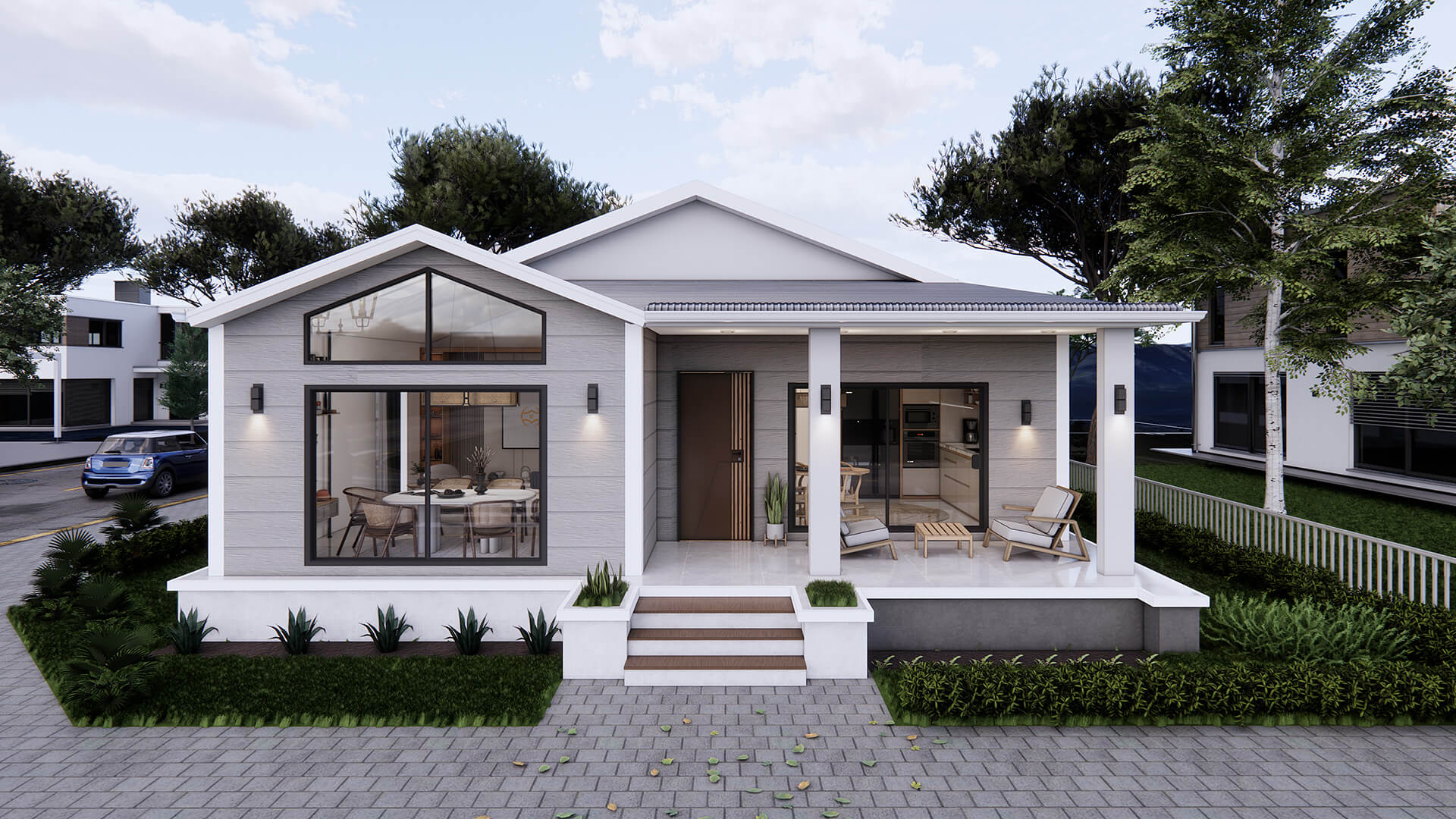 Bu modern evin dış cephesi, beyaz ve gri tonlarında kaplamalarıyla dikkat çekmektedir. Minimalist bir anlayışla tasarlanan geniş cam pencereler ve ahşap detaylar, evin estetik görünümünü tamamlamaktadır. Geniş bir veranda ise iki sütunla desteklenmiş olup, evin davetkar ve ferah atmosferine katkı sağlar. Verandanın sağ tarafında, iki sandalye ve bir sehpadan oluşan bir oturma alanı bulunmaktadır.