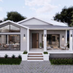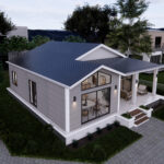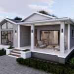 Bu modern evin dış cephesi, beyaz ve gri tonlarında kaplamalarıyla dikkat çekmektedir. Minimalist bir anlayışla tasarlanan geniş cam pencereler ve ahşap detaylar, evin estetik görünümünü tamamlamaktadır. Geniş bir veranda ise iki sütunla desteklenmiş olup, evin davetkar ve ferah atmosferine katkı sağlar. Verandanın sağ tarafında, iki sandalye ve bir sehpadan oluşan bir oturma alanı bulunmaktadır.
