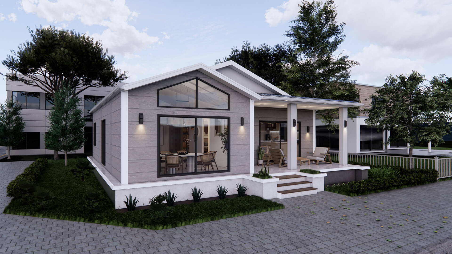 Evin girişi, ortada konumlandırılmıştır ve kapının her iki yanında modern tasarımlı duvar aplikleri yer alır. Sol tarafta, büyük bir pencere ve bu pencerenin arkasında yemek masası ve sandalyeler gözükmektedir. Evin sağ tarafında ise mutfak alanı bulunmaktadır ve bu alan, cam kapılar aracılığıyla verandaya açılarak iç ve dış mekanlar arasında kesintisiz bir geçiş sağlar.