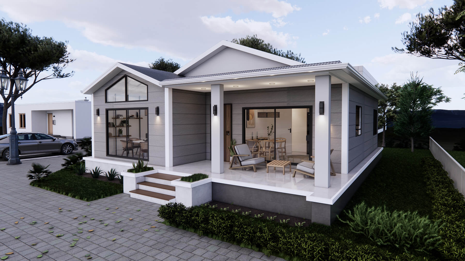 - Modern Tasarım: Beyaz ve gri tonlarındaki dış cephe kaplaması, geniş cam pencereler ve ahşap detaylar.