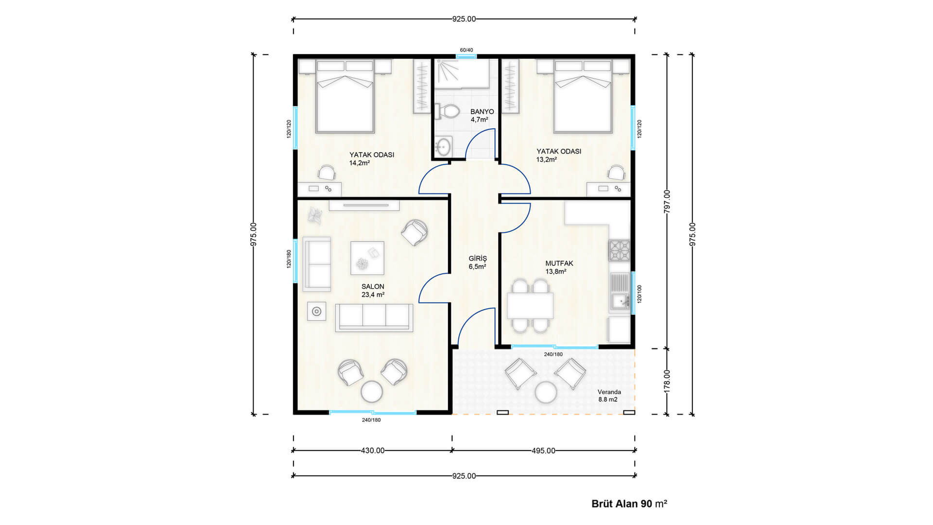 - Fonksiyonel Alanlar: Büyük pencerelerle aydınlatılmış yemek alanı ve verandaya açılan mutfak.