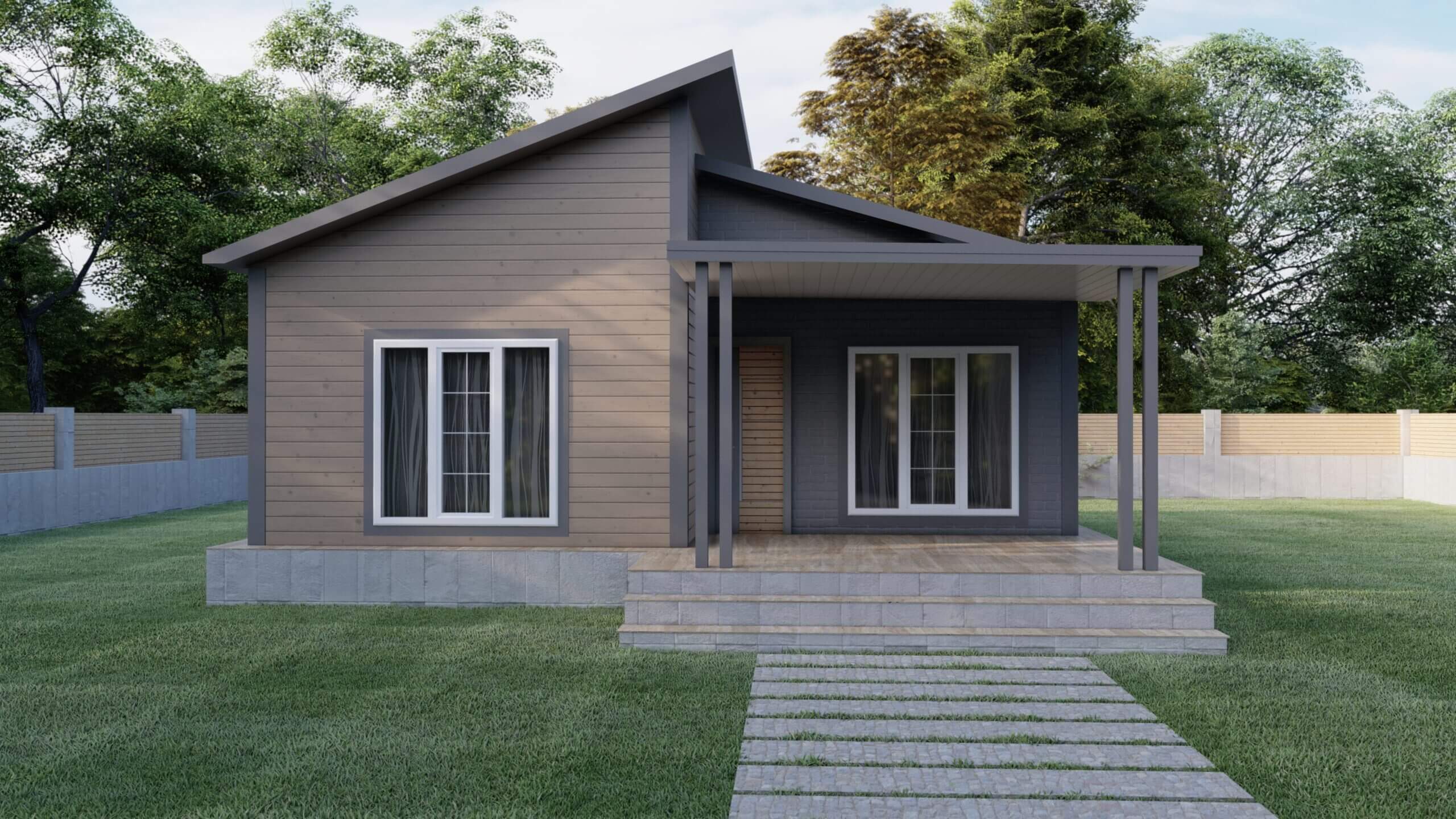 Bu resimde görülen tek katlı ev, modern ve minimalist bir tasarıma sahip olup, ahşap kaplama dış cephesiyle öne çıkmaktadır. Evin cephesinde gri tonlarında çerçeveler ve sütunlar kullanılmıştır. Ön cephede, sol ve sağ tarafta konumlandırılmış iki büyük pencere yer almaktadır. Evin ortasında, iki sütunla desteklenen ve birkaç basamakla yükseltilmiş küçük bir veranda bulunmaktadır. Çevresi çimlerle kaplı olup, arka planda ağaçlar ve çitler görünmektedir. Bu ev, sade ve şık tasarımıyla dikkat çekmekte ve doğayla iç içe bir yaşam alanı sunmaktadır.