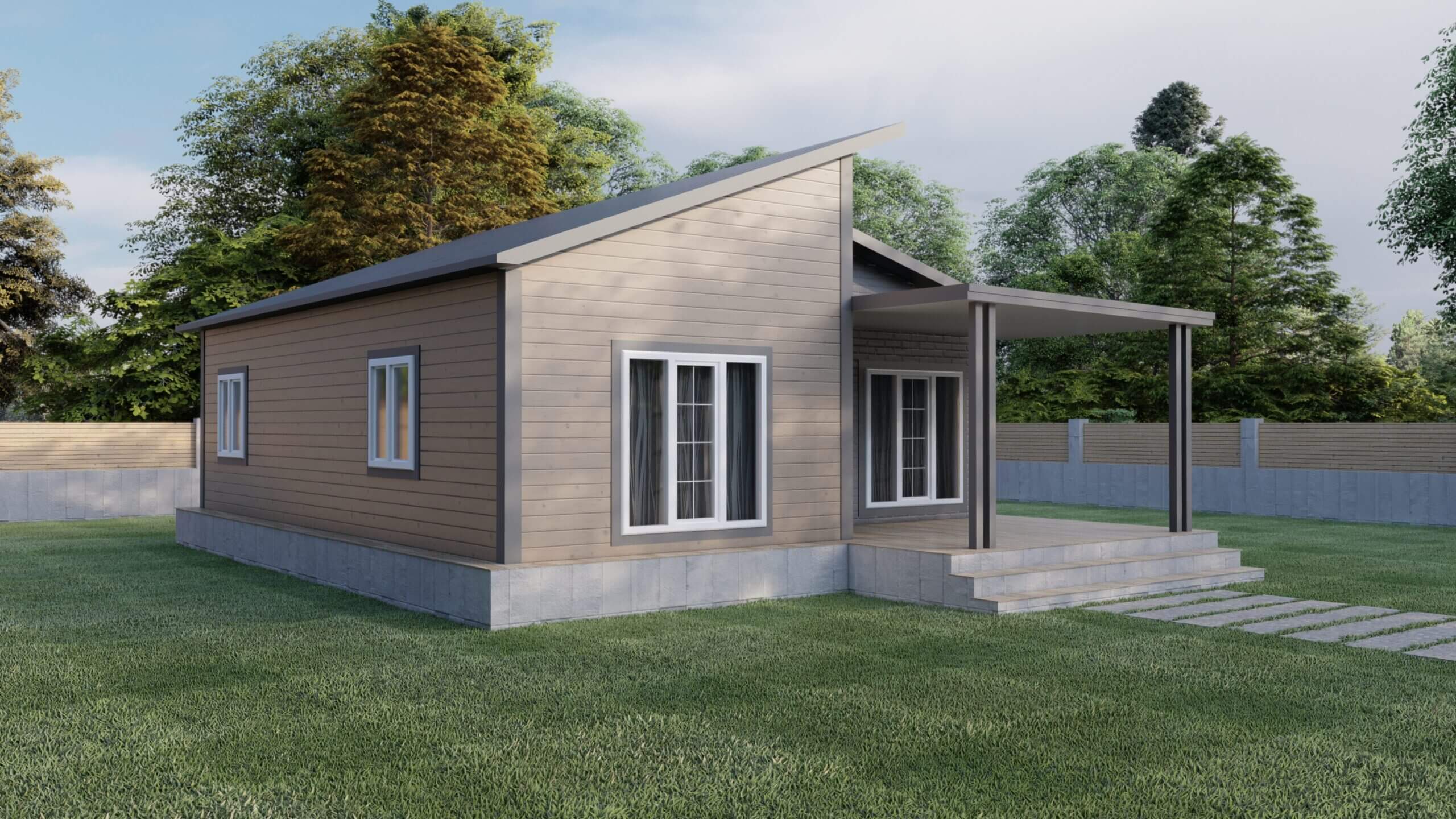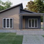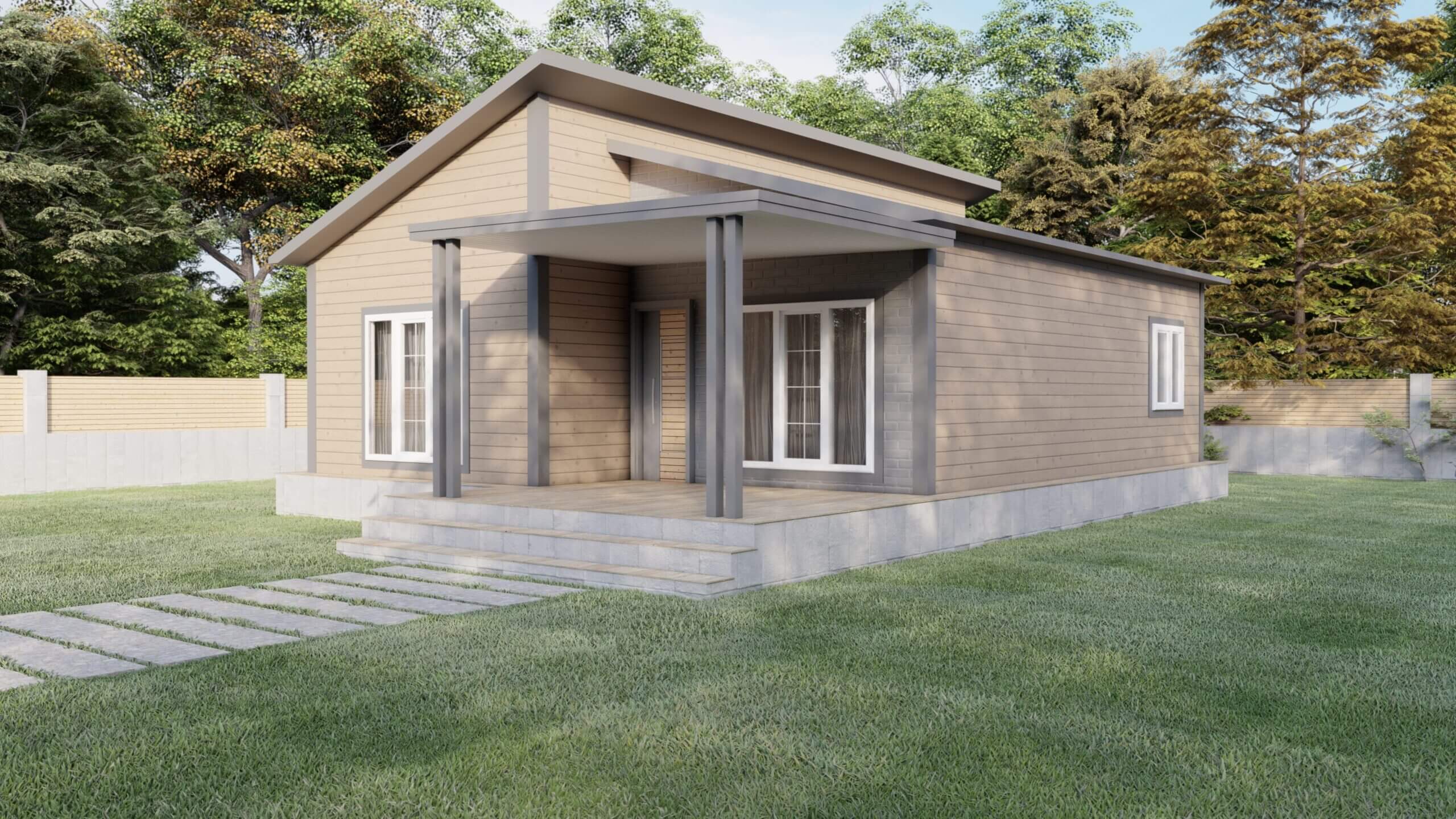 Bu resimde görülen tek katlı ev, modern ve minimalist bir tasarıma sahip olup, ahşap kaplama dış cephesiyle öne çıkmaktadır. Evin cephesinde gri tonlarında çerçeveler ve sütunlar kullanılmıştır. Ön cephede, sol ve sağ tarafta konumlandırılmış iki büyük pencere yer almaktadır. Evin ortasında, iki sütunla desteklenen ve birkaç basamakla yükseltilmiş küçük bir veranda bulunmaktadır. Çevresi çimlerle kaplı olup, arka planda ağaçlar ve çitler görünmektedir. Bu ev, sade ve şık tasarımıyla dikkat çekmekte ve doğayla iç içe bir yaşam alanı sunmaktadır.