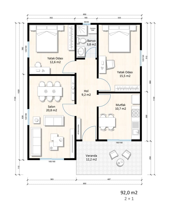• Geniş Pencereler: Evin sol ve sağ tarafında yer alan iki büyük pencere.